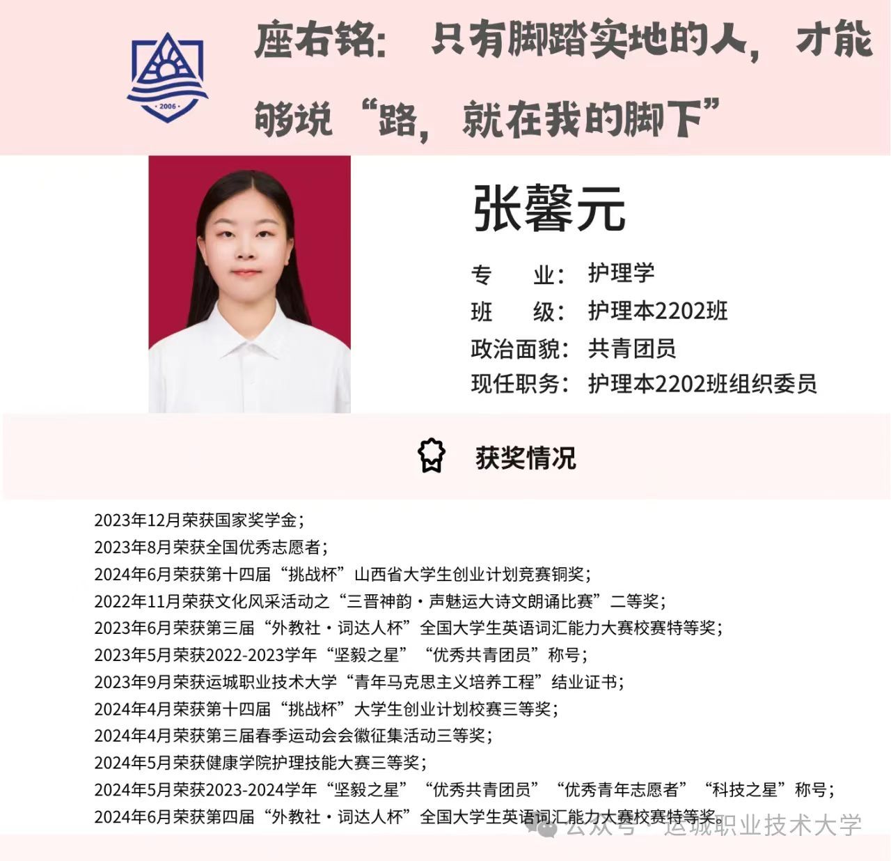 张馨元寄语运大的学弟学妹们,人生就像爬山一样,只有不停地往前攀登,才能到达心灵的巅峰。无论遇到多少困难与挑战,都要坚定自己的目标,勇敢地迎接每一个挑战。青春梦想将绚丽绽放,创造与众不同的精彩!