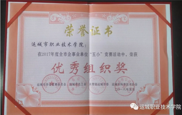 2018年荣获运城市2017年“五小”竞赛活动“优秀组织奖”